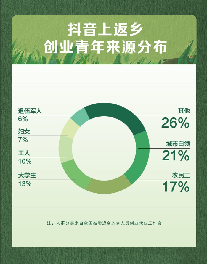 6月22日,抖音發(fā)布首份三農(nóng)數(shù)據(jù)報告(以下簡稱“報告” )。過去一年,抖音農(nóng)村視頻總獲贊量129億,農(nóng)村視頻創(chuàng)作者收入同比增長15倍。抖音三農(nóng)創(chuàng)作者中,返鄉(xiāng)創(chuàng)業(yè)青年占比54%,城市白領(lǐng)返鄉(xiāng)創(chuàng)業(yè)比例最高,其次為農(nóng)民工。報告還從三農(nóng)創(chuàng)作者來源最多的省份縣域、最受歡迎的三農(nóng)視頻內(nèi)容等多角度解析目前抖音三農(nóng)內(nèi)容生態(tài)。