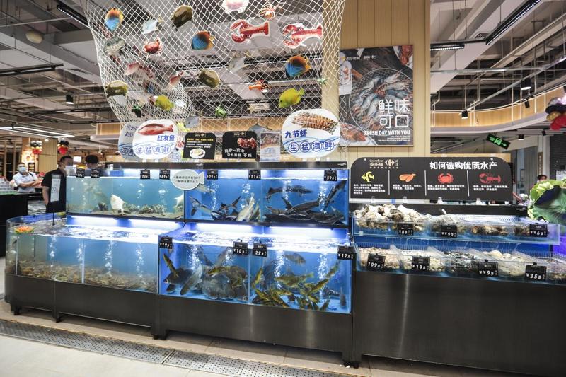 暢游的鱘魚、張牙舞爪的小龍蝦、不斷彈尾的波士頓龍蝦,生猛異常。據(jù)悉,鮮活水產(chǎn)的進駐家樂福密謀已久。過往超市水產(chǎn)區(qū)域品類以淡水活魚與冰鮮產(chǎn)品為主,鮮活海鮮十分罕見。今年5月,家樂福與國內(nèi)龍頭合作,將來自全國各大產(chǎn)地的鮮活水產(chǎn)品,經(jīng)過抽查、驗收、分揀等工序,每天到店,成為首家規(guī)模化啟動鮮活海鮮自營的雙線零售商超。