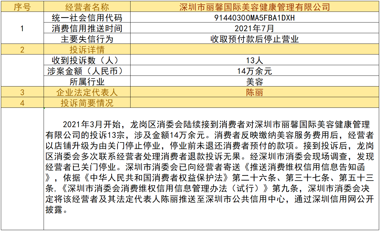 近日,深圳市消委會(huì)將九家“跑路”、未按約定退還消費(fèi)者預(yù)付款項(xiàng)的經(jīng)營(yíng)者及其主要負(fù)責(zé)人推送至深圳市公共信用中心,失信經(jīng)營(yíng)者信息信息將通過(guò)深圳信用網(wǎng)公開(kāi)披露。
