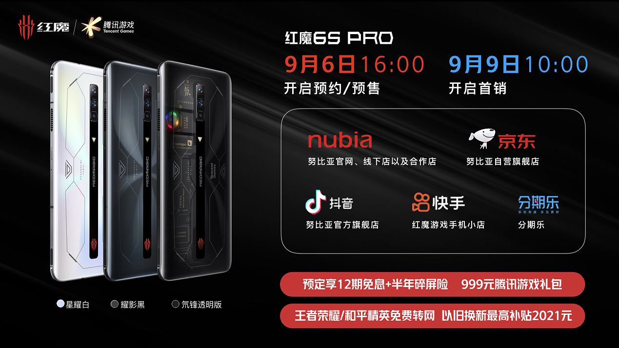 紅魔6S Pro目前已在努比亞官網(wǎng),努比亞京東自營旗艦店開啟預售,9月9日上午10點全國線上線下渠道同步開售!現(xiàn)在預定享12期免息并贈送半年碎屏險,購機尊享價值999元的騰訊游戲禮包、王者榮耀/和平精英免費轉(zhuǎn)網(wǎng)資格,以舊換新最高補貼2021元。