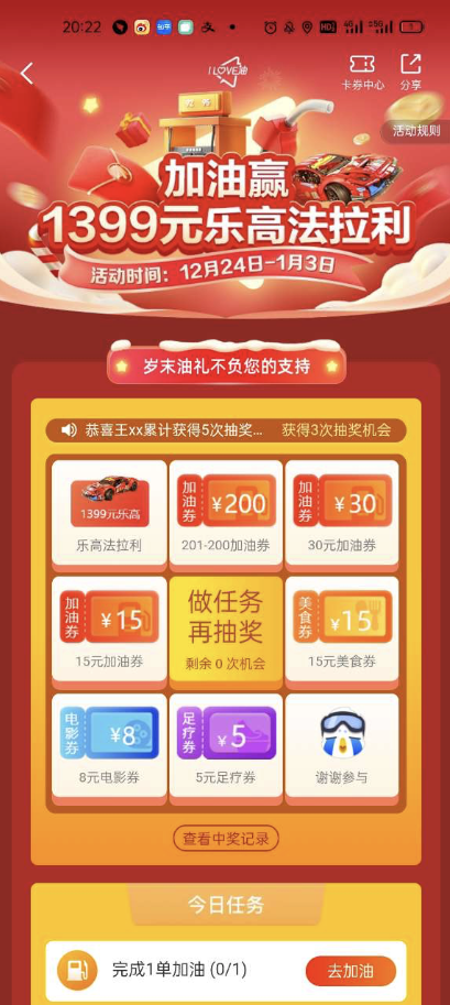此外,“歲末油禮 ·油衷感謝”活動期間,用戶在體驗(yàn)高德加油不下車服務(wù)便利的同時(shí),還可以參加樂高玩具、201 -200免減等新年禮物的抽獎,大獎天天有。