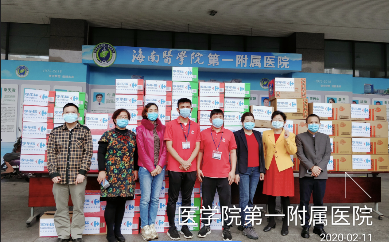??谔K寧家樂福于2月11日上午,向海南醫(yī)學(xué)院第一附屬醫(yī)院捐贈(zèng)了一批生活方便食品,涵蓋速食面、牛奶、八寶粥、功能飲料等。