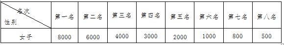 根據(jù)槍聲計(jì)時(shí)成績錄取女子第一名至第五十名運(yùn)動員現(xiàn)場頒發(fā)獲獎證書,前八名并分別獲得獎金(單位:人民幣元),前三名另外頒發(fā)獎杯一座、完賽獎牌一枚、領(lǐng)獎服裝一套。