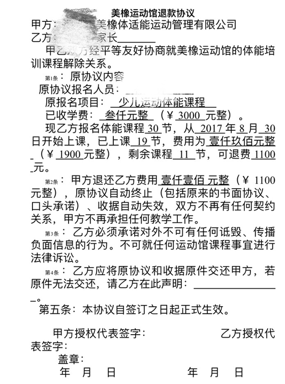 我于2017年8月30日續(xù)報深圳市美橡體適能運動管理有限公司體能課程,已經(jīng)是第三次報了,每次3000元,30節(jié)課,都是與教練微信溝通與轉(zhuǎn)帳。2018年1月10日收到該公司通知說結(jié)束體能館的業(yè)務,不再營業(yè),說統(tǒng)一給我們退剩余的課程費用,12號加了該公司財務微信溝通相關(guān)退費事宜,財務說統(tǒng)計好在一周內(nèi)統(tǒng)一給我們退費,19號收到財務信息,說可以退回1100元,還說幾天后可以退款,并說好通過微信退還(當時壓根沒有說簽協(xié)議后再退),一周拖一周,在23號忽然發(fā)微信來通知說要求去簽協(xié)議才退款,當天又進行了協(xié)商,因為我?guī)z小孩實在抽不出時間去他們公司,能否把協(xié)議發(fā)到我郵箱確認,財務說先與他老板匯報后第二天給回復,但第二天也沒有收到任何回復,然后又問財務協(xié)議發(fā)過來了嗎?財務二話沒說就把協(xié)議通過微信發(fā)給我,當時想想簽了就算了,但細看第三、四條真的很難讓人接受,內(nèi)容詳見附件1。我們交費的時候什么協(xié)議、收據(jù)對方都沒給,現(xiàn)在退錢就要求我們簽協(xié)議,而且是霸王條款,還叫我寫上“我自愿終止培訓課程”,老天哪是我自愿的,真是有種迫良為猖的感覺,還有第三條,也太污辱人格了,再次和他們友好協(xié)商希望把協(xié)議第三條改了,對方視而不見,不理不睬,也不積極回應。