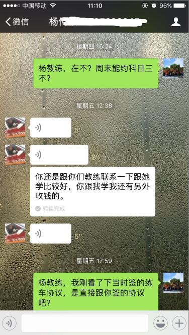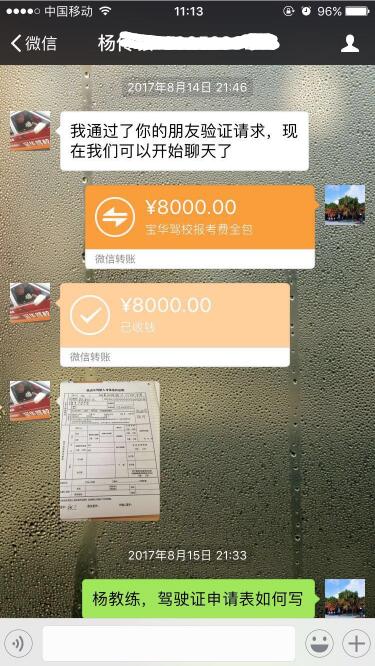 2017年8月,陳先生與寶華駕校教練員楊某銀簽《駕駛員培訓(xùn)合同》,并支付了全款培訓(xùn)費用8000元(見微信截圖)。2018年1月,陳先生通過科目二考試后,與楊某預(yù)約科目三考試。楊某提出要再次收費(詳見聊天記錄)。陳先生與楊某溝通無效后,向該教練掛靠的寶華駕校投訴維權(quán),寶華駕校反應(yīng)“其一,駕校不接收學(xué)員不與學(xué)員簽合同;其二,教練的投訴先調(diào)查了解”,后續(xù)再無反饋。