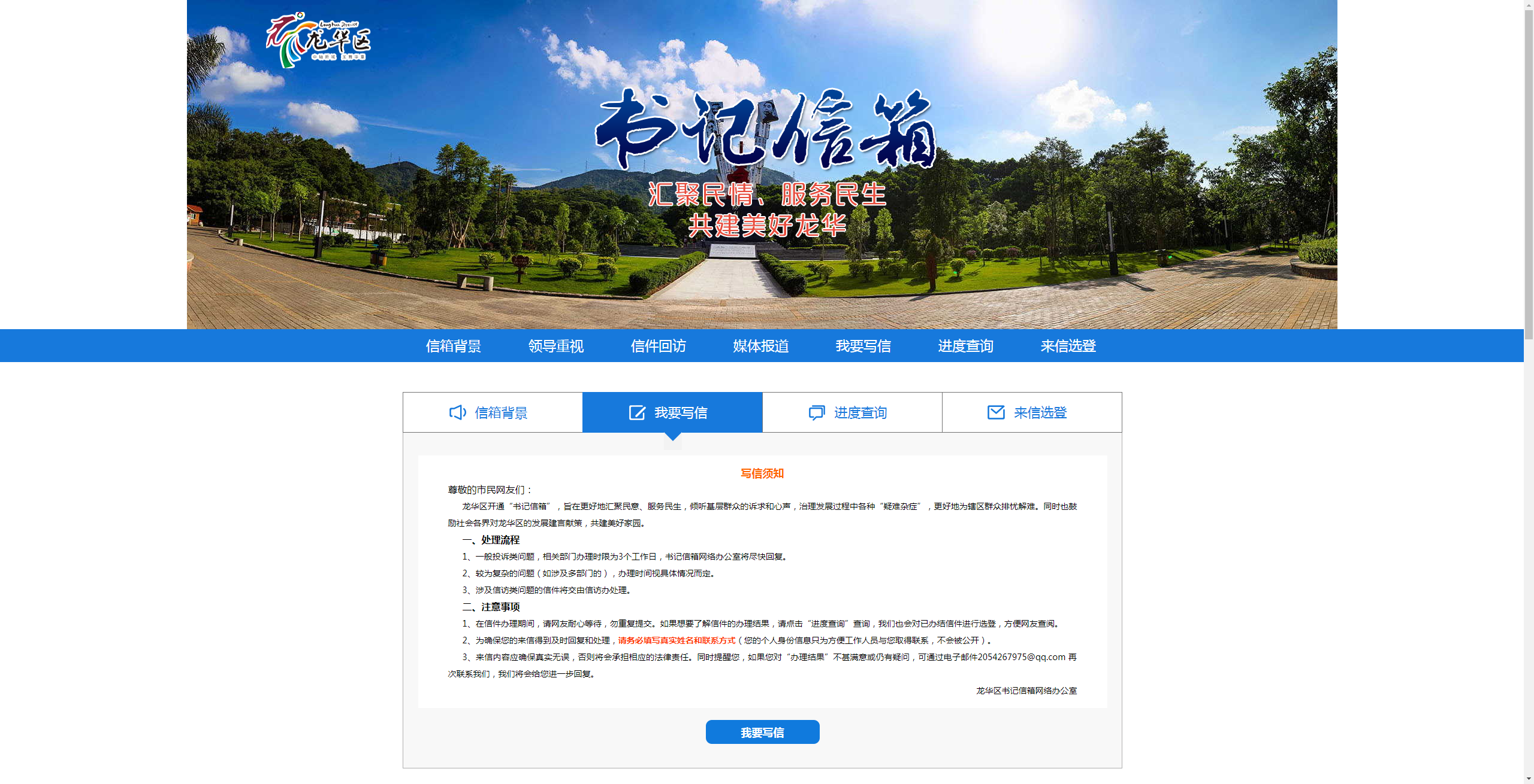 龍華區(qū)“書記信箱”網(wǎng)絡(luò)平臺(tái)是由龍華區(qū)領(lǐng)導(dǎo)的指導(dǎo)下搭建的網(wǎng)絡(luò)信息平臺(tái),由深圳新聞網(wǎng)團(tuán)隊(duì)進(jìn)行開發(fā)搭建?!皶浶畔洹钡臉?gòu)建,是龍華區(qū)委貫徹落實(shí)黨的群眾路線,踐行“三嚴(yán)三實(shí)”的一項(xiàng)新舉措?!皶浶畔洹弊?015年10月31日正式上線以來,逐步成為龍華市民向龍華區(qū)委反映、提出建議、意見和投訴請求的重要渠道。