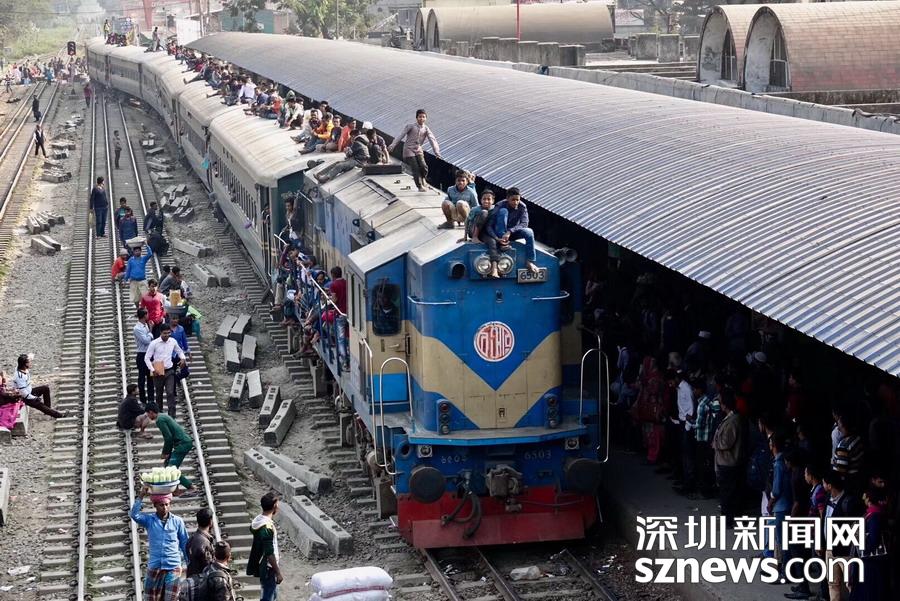 從達(dá)卡到邁門(mén)辛的火車(chē)是國(guó)內(nèi)最擁擠的線路之一,通常有數(shù)千名旅客擠在載客人數(shù)只有650人的火車(chē)?yán)铮械淖ブ咽郑械亩自陂T(mén)口,要不就蹲在車(chē)箱間的聯(lián)軸上或坐在車(chē)頂上。李仁奇攝