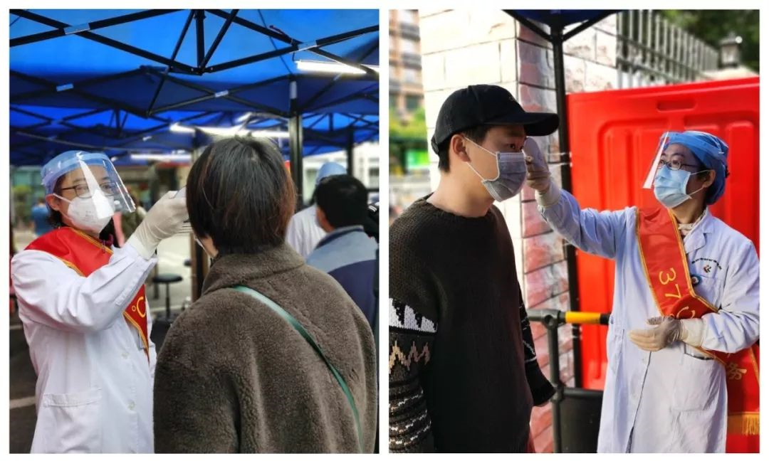 一名黨員志愿者正在為進(jìn)入醫(yī)院大樓的市民測體溫。“36.5度,一切正常,請您繼續(xù)做好疫情防護(hù),切不能掉以輕心?!?/p>