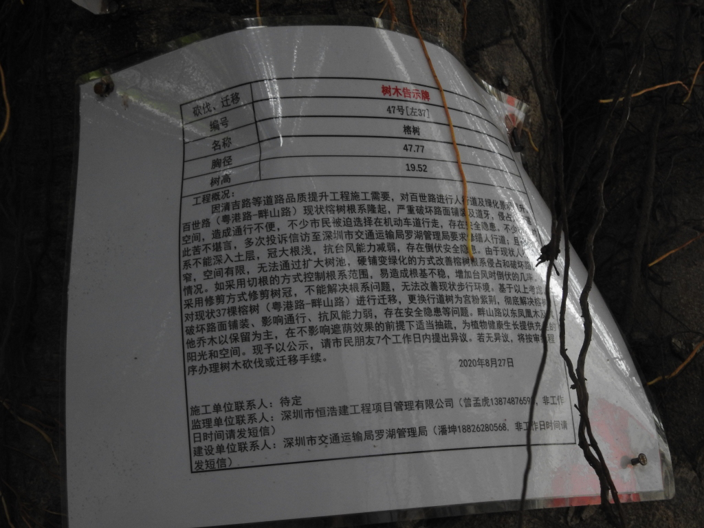 9月11日,市交通運(yùn)輸局羅湖管理局回應(yīng)表示,稱“經(jīng)核實(shí),百世路西段北側(cè)(畔山路以西)樹木為大葉榕,屬于榕樹的一種,榕樹有多種,如小葉榕、大葉榕、高山榕、垂葉榕等,百世路榕樹現(xiàn)狀根系已確實(shí)對(duì)人行道造成破壞?!睂?duì)于其它樹被砍的情況,“僅對(duì)影響道路轉(zhuǎn)彎半徑(畔山路右轉(zhuǎn)百世路)的兩棵鳳凰樹遷移砍伐”。并在不影響遮陰的情況下“對(duì)北側(cè)過密其他喬木進(jìn)行抽梳”。