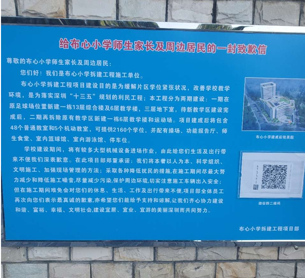 對(duì)于家長(zhǎng)最關(guān)心的學(xué)生安全問(wèn)題,羅湖區(qū)教育局回應(yīng)道:“建設(shè)方案經(jīng)過(guò)專(zhuān)家論證評(píng)審,對(duì)原有教學(xué)樓無(wú)安全影響。實(shí)施過(guò)程邀請(qǐng)第三方安全監(jiān)測(cè)單位對(duì)教學(xué)樓進(jìn)行監(jiān)測(cè),頻率每天一次,確保安全。施工過(guò)程還將采取一系列安全文明施工措施:一是易起塵作業(yè)面100%濕法施工;二是裸露土及易起塵物料1做到00%覆蓋;三是每個(gè)出入口100%安裝沖洗設(shè)施;四是安裝隔音圍擋;五是錯(cuò)開(kāi)教學(xué)時(shí)間施工等。把影響學(xué)校的安全及教學(xué)環(huán)境降到最低?!背艘酝?,布心小學(xué)已成立建設(shè)安全領(lǐng)導(dǎo)小組,不定期召開(kāi)家委會(huì)通報(bào)建設(shè)情況。羅湖區(qū)教育局相關(guān)安全辦和基建科室,也實(shí)時(shí)掌握和管理項(xiàng)目建設(shè)安全情況。