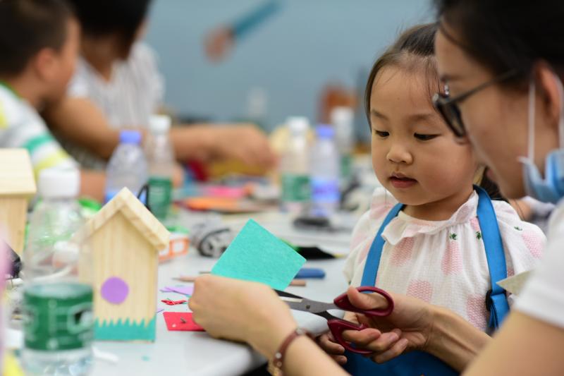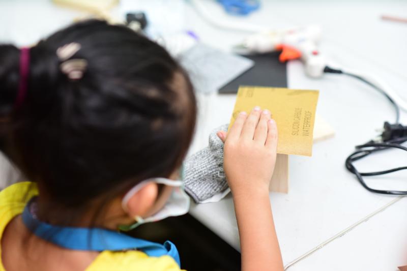 “小朋友們,像我一樣,找到這兩個(gè)結(jié)構(gòu)部件,然后將他們拼接在一起……”現(xiàn)場,老師一邊為小朋友們講解著手工音樂盒的搭建步驟,一邊現(xiàn)場為孩子們示范制作過程。坐在四周的“小小木匠”們一個(gè)個(gè)伸長了脖子,或站或坐,看著老師演示,一字不落的將老師的講解銘記在心。“老爸,鋸子原來要以這樣的角度去鋸才更省力呀?!币晃粍倓傮w驗(yàn)過木工工具的小朋友滿臉興奮的跟自己的父親說道。