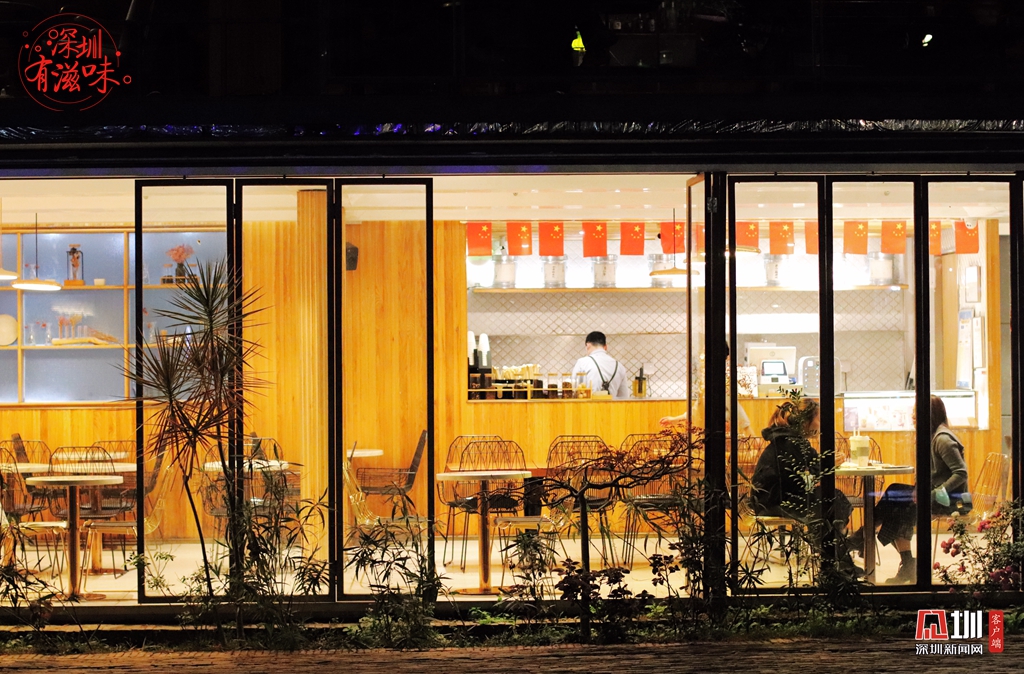 夜幕降臨,燈光從茶飲店一整面開敞的落地門窗投射出暖意。