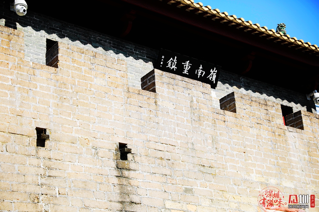 南頭古城的城墻上,掛著“嶺南重鎮(zhèn)”牌匾。(陳致遠(yuǎn) 攝)