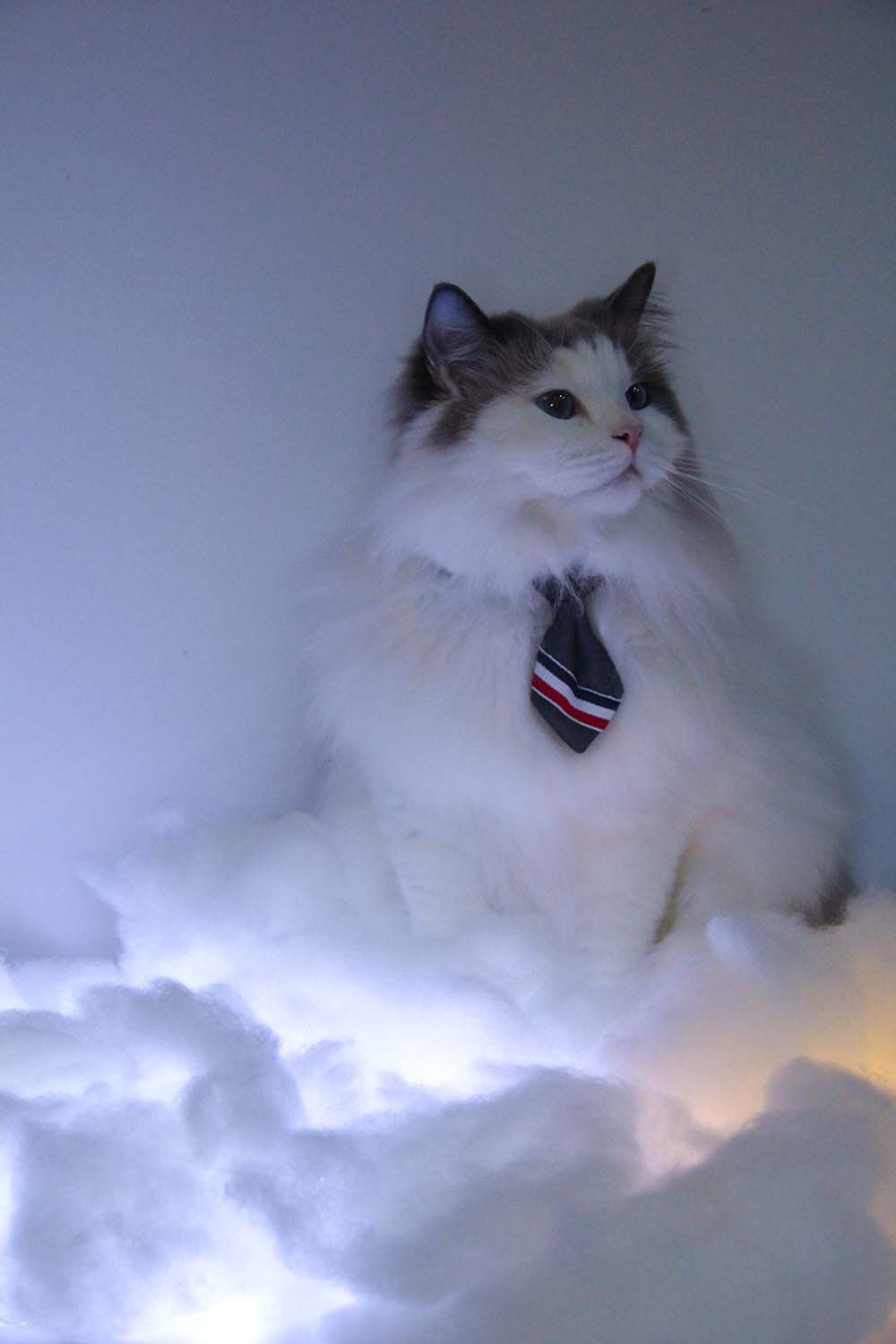 此次展出的拍攝主題有兩個系列。第一個系列主題為“云吸貓”,詞語本意是在網(wǎng)絡(luò)上吸貓,品牌團(tuán)隊(duì)以此作為靈感,設(shè)計(jì)云端的場景,打造出一組貓咪在云端的可愛作品。第二個系列則按照模特的風(fēng)格量身定制,充分展示了模特的個人風(fēng)采。