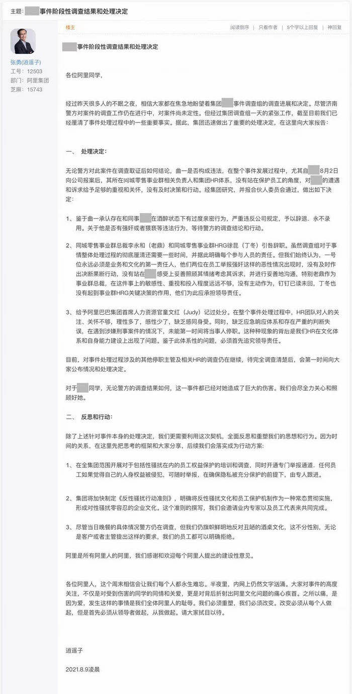 8月9日凌晨,阿里巴巴董事會(huì)主席兼CEO張勇在阿里內(nèi)網(wǎng)公布了“女員工被侵犯”的階段性?xún)?nèi)部調(diào)查結(jié)果和處理決定。