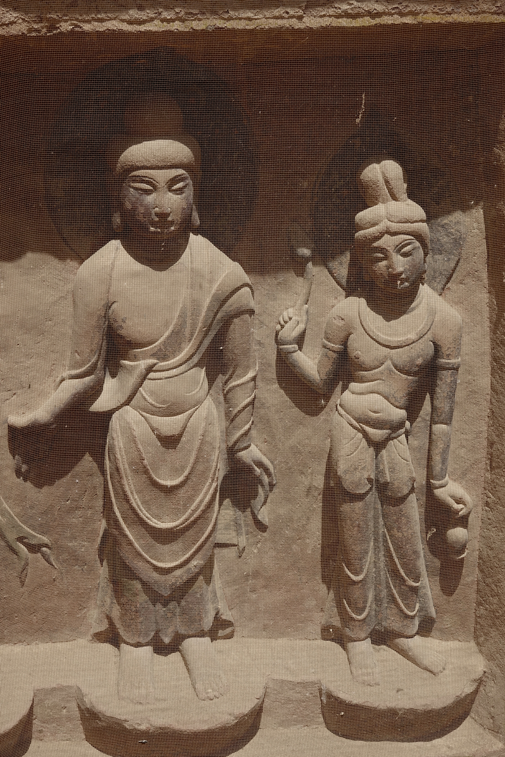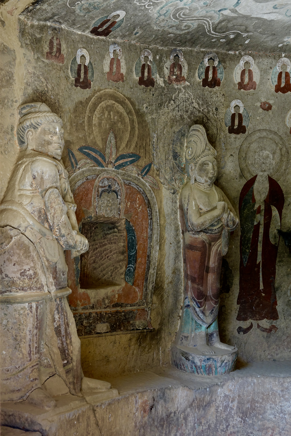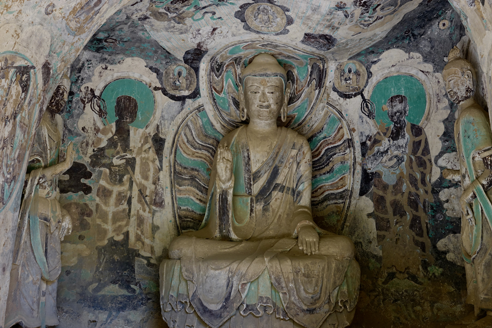 82窟,一結(jié)跏趺坐佛二脅侍菩薩,佛左右壁畫二弟子。窟頂和門道露出底層,為北周原作,表層壁畫為明代重繪。李仁奇 攝