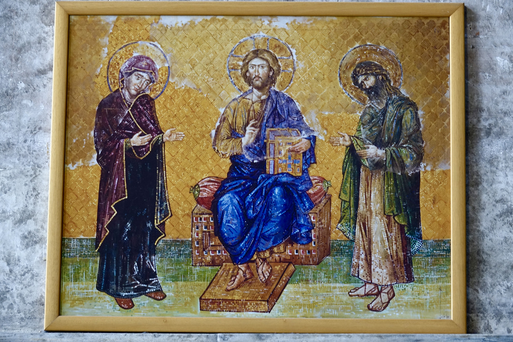 馬賽克《三圣像》,畫面下方已經(jīng)被嚴(yán)重?fù)p毀,但仍然能看到中央的耶穌基督,其兩側(cè)是圣母瑪利亞和施洗者約翰。李仁奇 攝