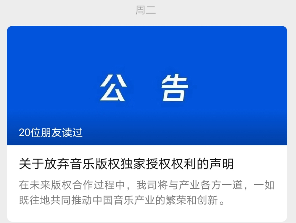 (相關(guān)報道:發(fā)聲明放棄音樂版權(quán)獨家授權(quán),騰訊為啥這樣做)