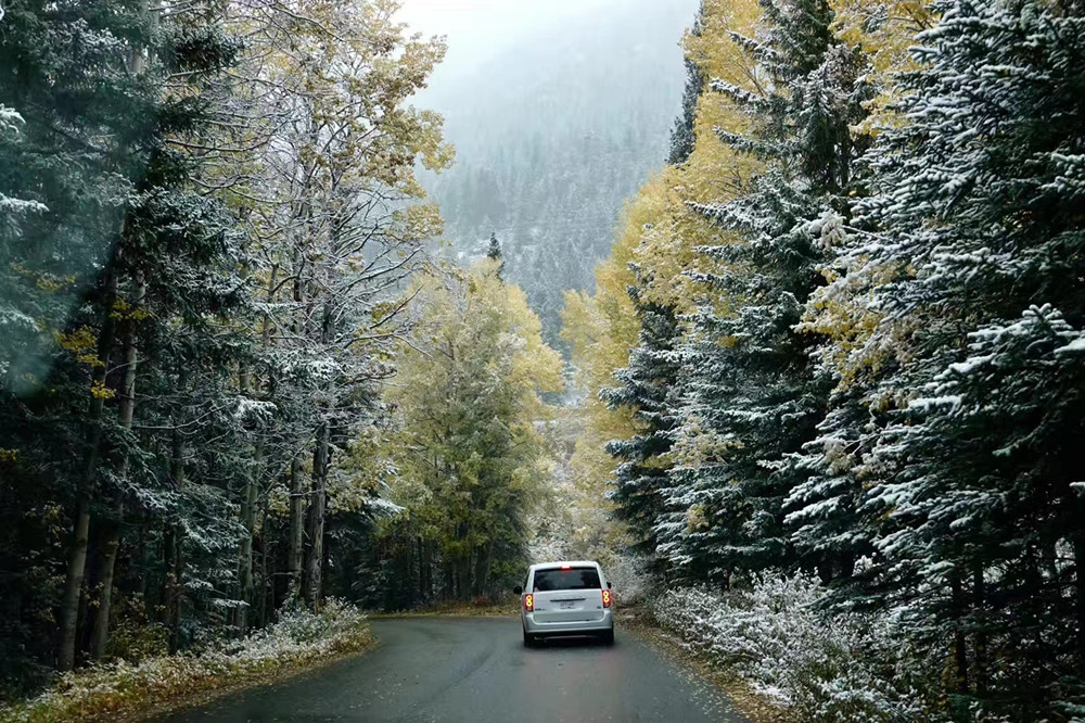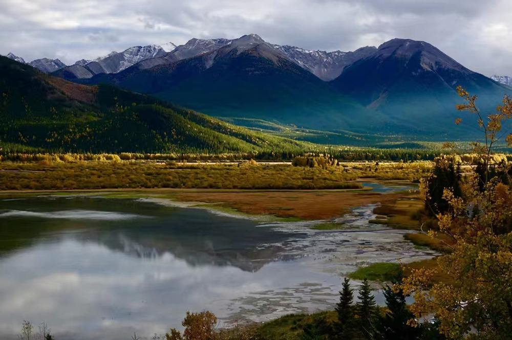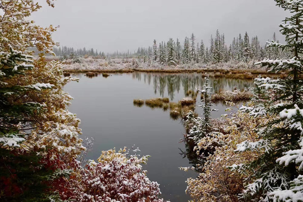 秋季是班夫最美的季節(jié),像九寨溝一樣,在藍(lán)色湖泊、綠色叢林之外,又多出了紅色和黃色的樹葉,映襯在白色的雪山之中,呈現(xiàn)出一個(gè)五彩繽紛的世界。李仁奇 攝