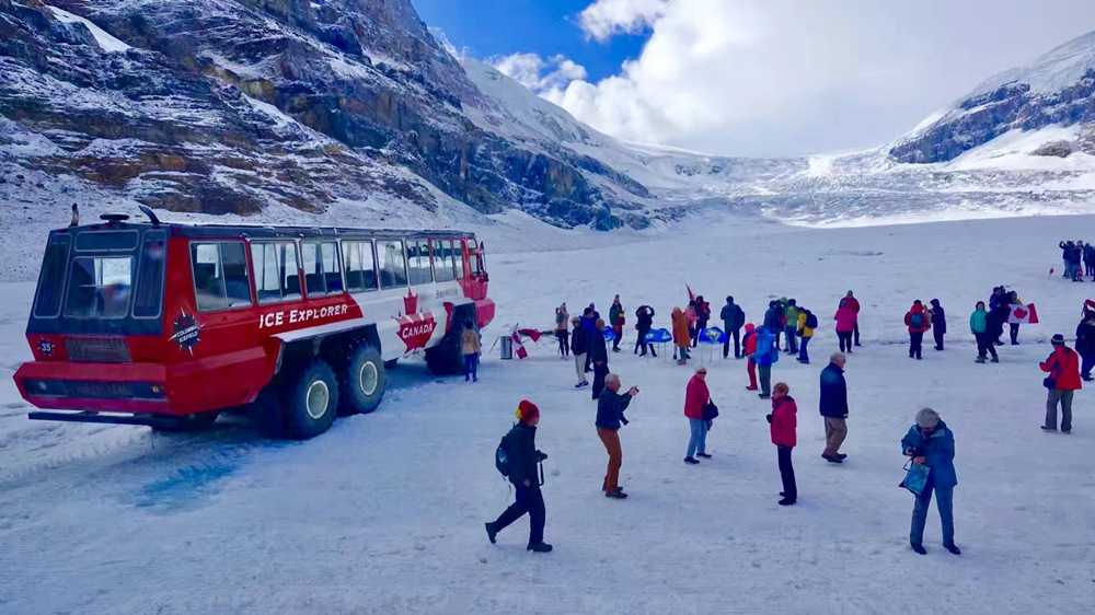哥倫比亞冰原是北美洲最容易進(jìn)入的冰川群。乘坐特別設(shè)計(jì)的“冰原探險(xiǎn)家號(hào)”全地形旅游巴士,可以輕松踏上長(zhǎng)達(dá)六千米的阿薩巴斯卡冰河上的冰原。李仁奇 攝