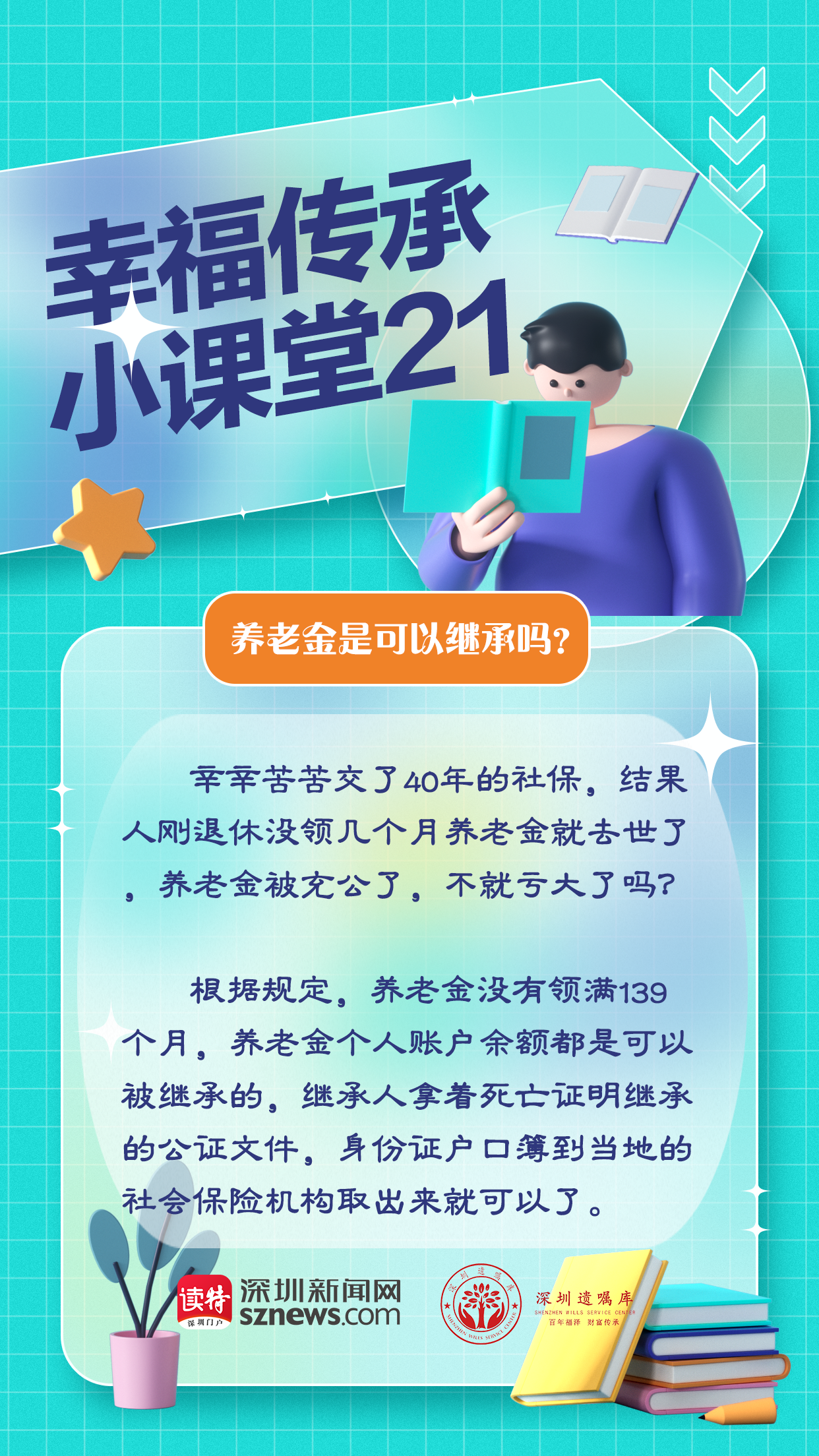 深圳遺囑庫與深圳新聞網(wǎng)聯(lián)合制作的幸福傳承小課堂第21期,我們來聊聊養(yǎng)老金繼承問題。根據(jù)規(guī)定,養(yǎng)老金沒有領(lǐng)滿139個月,養(yǎng)老金個人賬戶余額都是可以被繼承的。繼承人拿著死亡證明繼承的公證文件,身份證戶口簿到當(dāng)?shù)氐纳鐣kU機構(gòu)取出來就可以了。