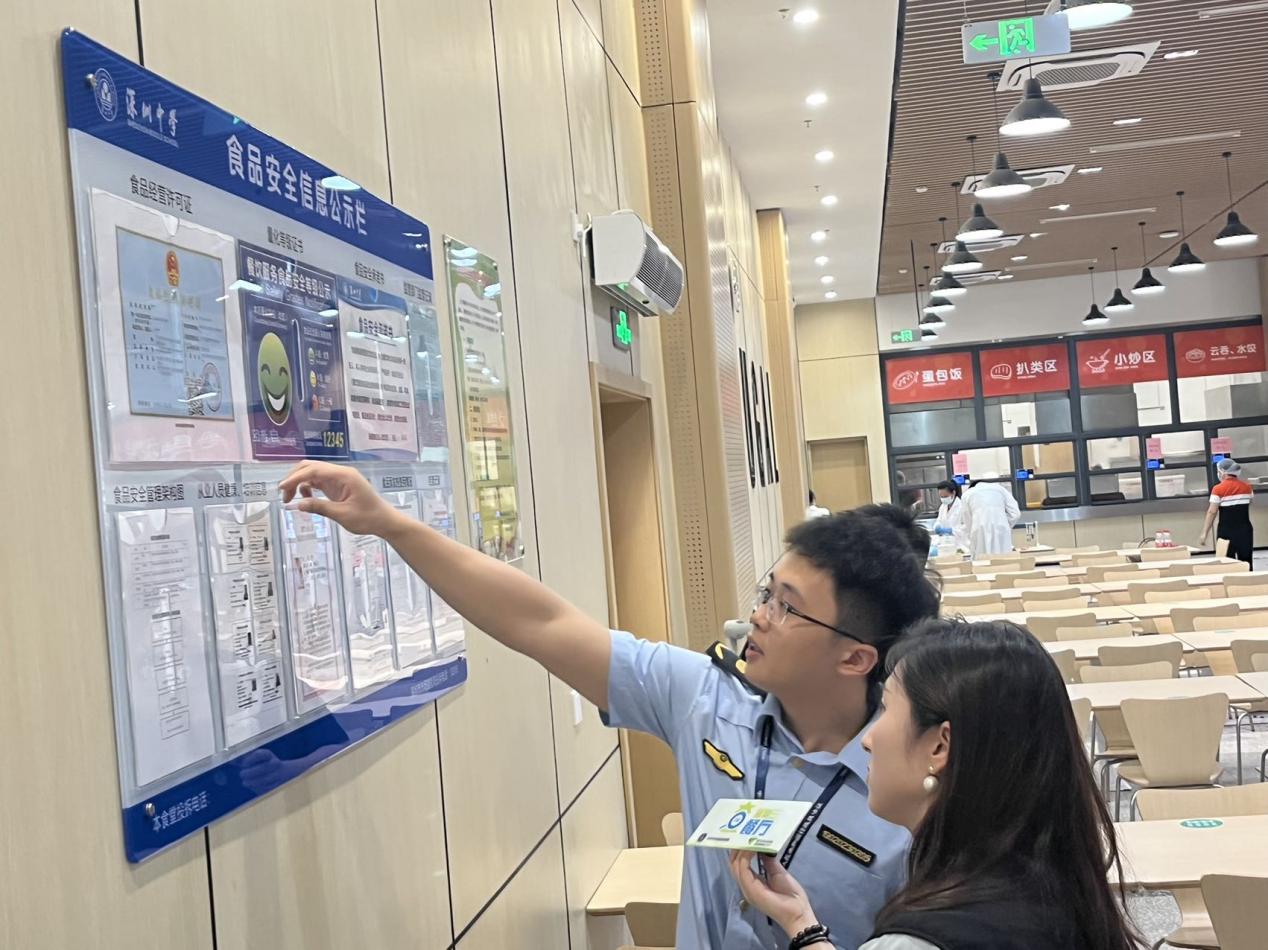 在食堂用餐區(qū),執(zhí)法人員依次查看食品安全公示欄、明廚亮灶系統(tǒng)、用餐區(qū)域消毒記錄等信息。檢查過程中發(fā)現(xiàn)部分從業(yè)人員健康證即將到期,深圳市市場(chǎng)監(jiān)督管理局羅湖監(jiān)管局執(zhí)法人員羅偉仁提醒,為保護(hù)從業(yè)人員自身及服務(wù)對(duì)象的健康,應(yīng)盡快更新辦理從業(yè)人員健康證。