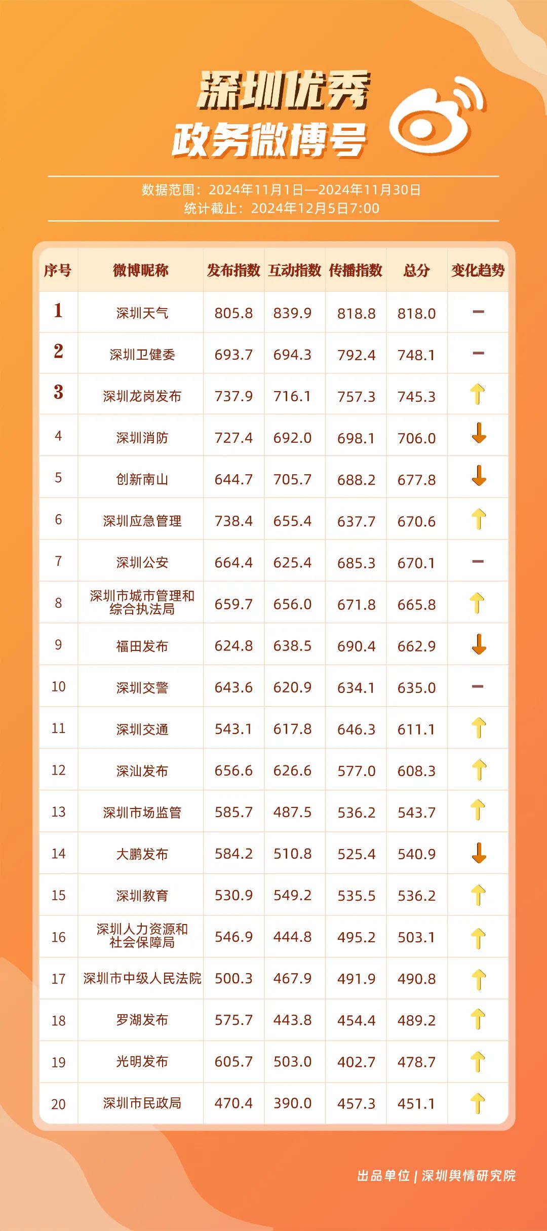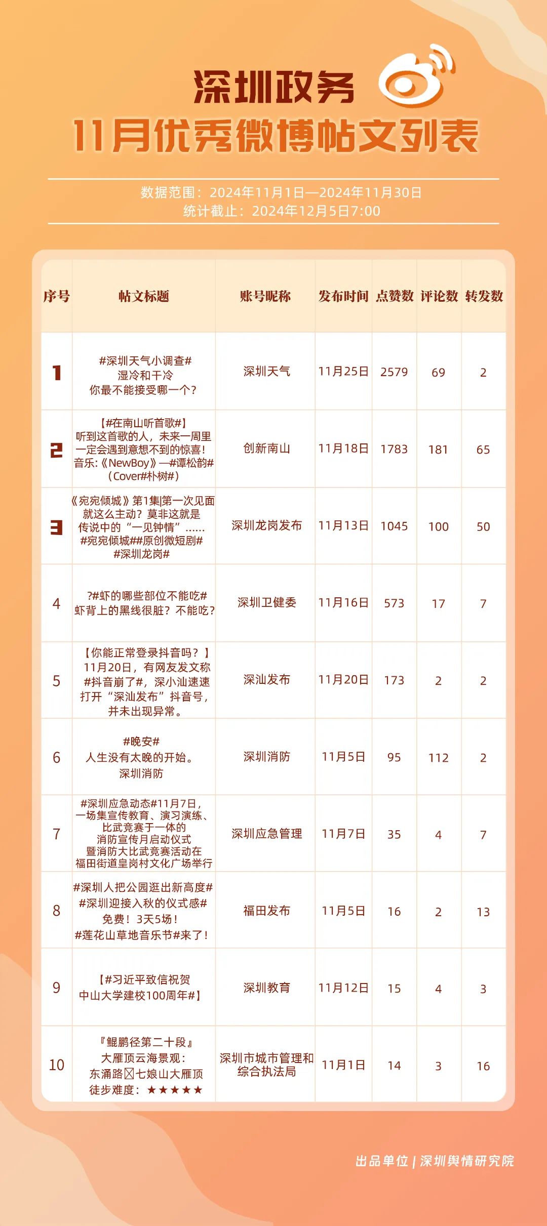11月,“深圳天氣”“深圳衛(wèi)健委”“深圳龍崗發(fā)布”“深圳消防”“創(chuàng)新南山”“深圳應(yīng)急管理”“深圳公安”“深圳市城市管理和綜合執(zhí)法局”“福田發(fā)布”“深圳交警”等20個賬號入選“優(yōu)秀政務(wù)微博號”?!吧钲谔鞖狻薄吧钲谛l(wèi)健委”賬號在信息傳播上不斷精進(jìn),為市民帶來及時、優(yōu)質(zhì)且高效的資訊,內(nèi)容緊貼民生,贏得了市民的廣泛贊譽(yù),排名穩(wěn)定在前2名。同時,“深圳龍崗發(fā)布”“深圳消防”和“創(chuàng)新南山”等賬號也能夠精準(zhǔn)滿足市民的信息需求,并在此基礎(chǔ)上提升市民閱讀體驗(yàn),推動了其在榜單上的穩(wěn)步提升,彰顯了政務(wù)微博的創(chuàng)新活力與社會價值。