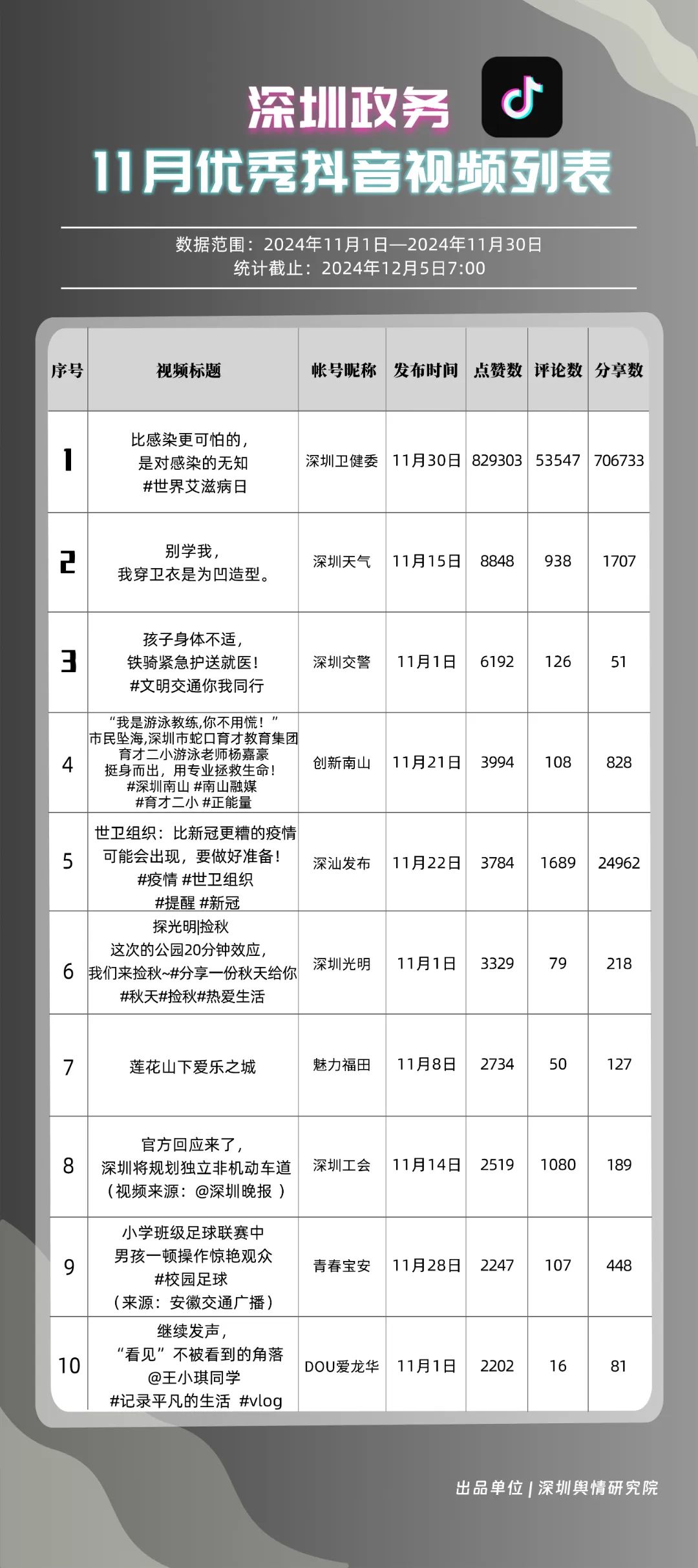 11月,“深圳衛(wèi)健委”“掌上龍崗”“深圳天氣”“深汕發(fā)布”“深圳工會”“深圳交警”“創(chuàng)新南山”“DOU愛龍華”“深圳光明”“中國前?!惫?0個政務(wù)抖音號獲得“深圳優(yōu)秀政務(wù)抖音號”稱號?!吧钲谛l(wèi)健委”憑借高質(zhì)量劇情內(nèi)容,巧妙融入健康知識,視頻累計(jì)收獲近百萬點(diǎn)贊。同時,“掌上龍崗”和“深圳天氣”也在視頻內(nèi)容創(chuàng)新上不斷探索,通過優(yōu)化宣傳策略和信息傳播方式,使得網(wǎng)民能夠在輕松愉快的氛圍中了解龍崗區(qū)的最新動態(tài)和深圳的天氣信息,展現(xiàn)了政務(wù)抖音號的獨(dú)特魅力與社會影響力。