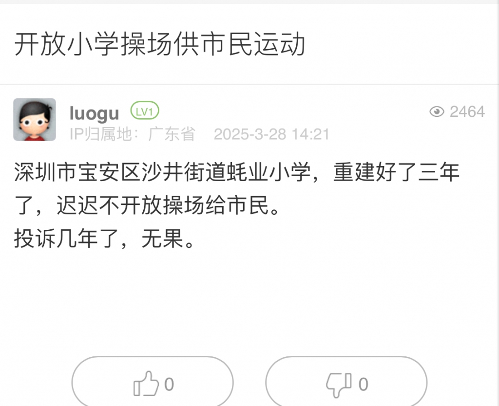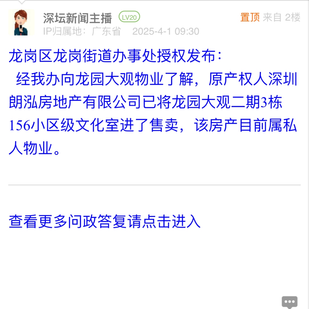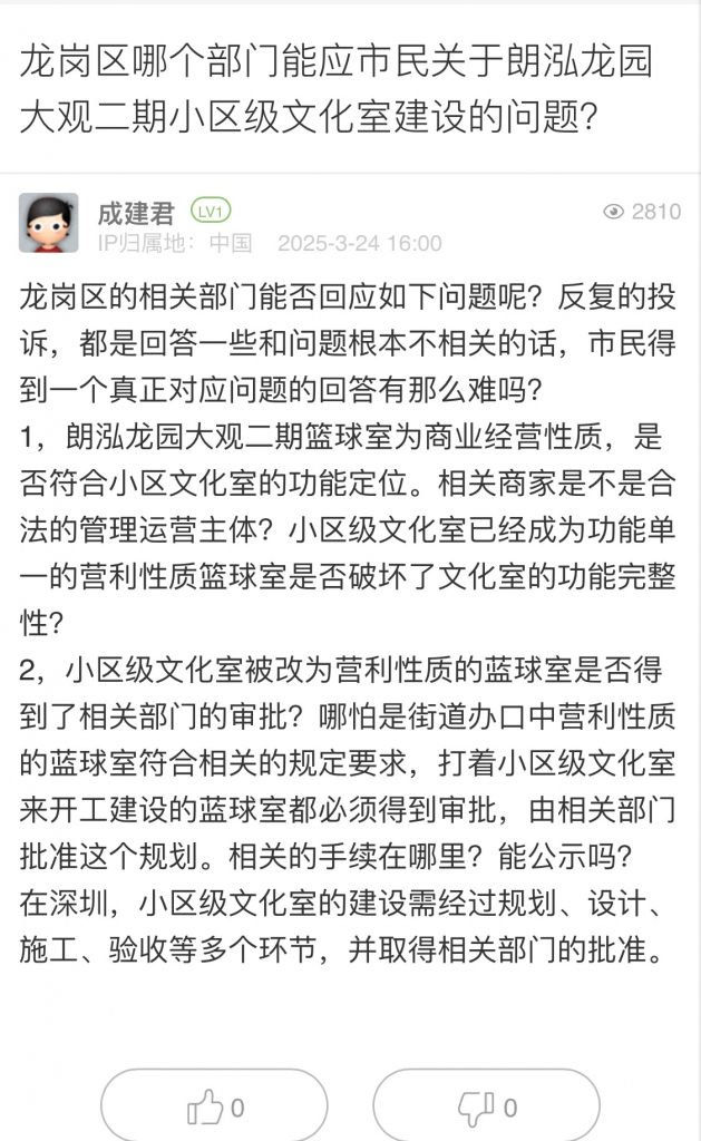 4. 帖文《龍崗區(qū)哪個部門能應(yīng)市民關(guān)于朗泓龍園大觀二期小區(qū)級文化室建設(shè)的問題?》