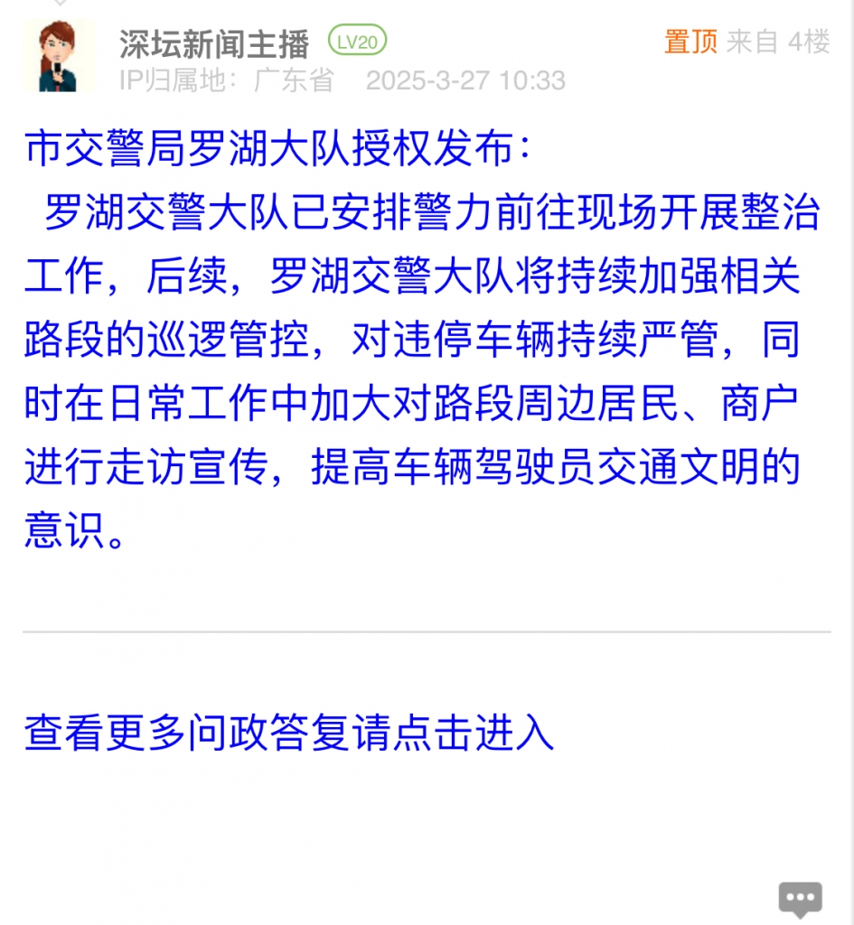 羅湖交警大隊已安排警力前往現(xiàn)場開展整治工作,后續(xù),羅湖交警大隊將持續(xù)加強(qiáng)相關(guān)路段的巡邏管控,對違停車輛持續(xù)嚴(yán)管,同時在日常工作中加大對路段周邊居民、商戶進(jìn)行走訪宣傳,提高車輛駕駛員交通文明的意識。