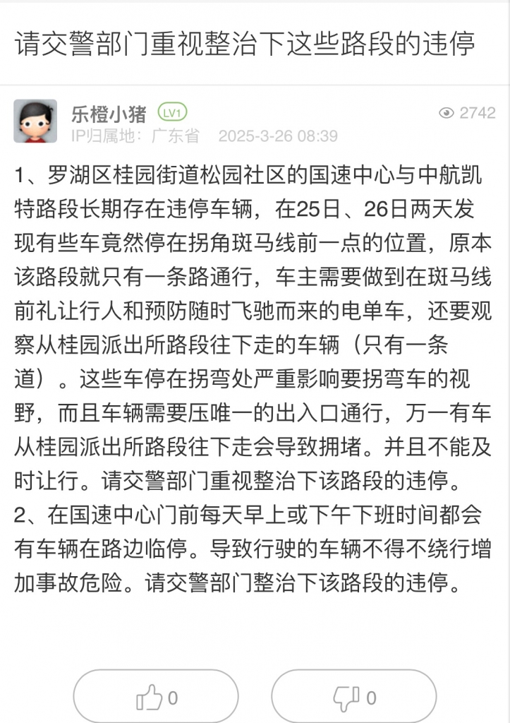8. 帖文《請交警部門重視整治下這些路段的違停》
