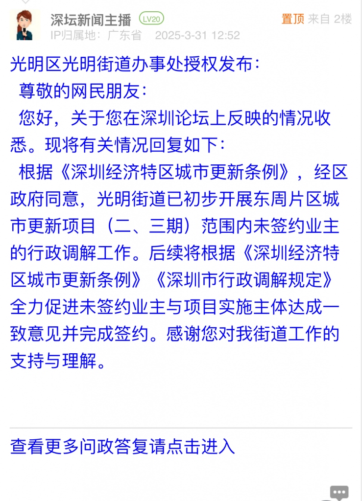 根據(jù)《深圳經(jīng)濟(jì)特區(qū)城市更新條例》,經(jīng)區(qū)政府同意,光明街道已初步開展東周片區(qū)城市更新項目(二、三期)范圍內(nèi)未簽約業(yè)主的行政調(diào)解工作。后續(xù)將根據(jù)《深圳經(jīng)濟(jì)特區(qū)城市更新條例》《深圳市行政調(diào)解規(guī)定》全力促進(jìn)未簽約業(yè)主與項目實施主體達(dá)成一致意見并完成簽約。感謝您對我街道工作的支持與理解。