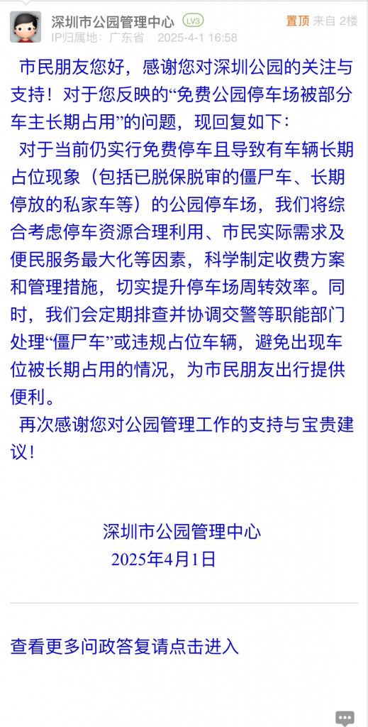 對于當(dāng)前仍實行免費停車且導(dǎo)致有車輛長期占位現(xiàn)象(包括已脫保脫審的僵尸車、長期停放的私家車等)的公園停車場,我們將綜合考慮停車資源合理利用、市民實際需求及便民服務(wù)最大化等因素,科學(xué)制定收費方案和管理措施,切實提升停車場周轉(zhuǎn)效率。同時,我們會定期排查并協(xié)調(diào)交警等職能部門處理“僵尸車”或違規(guī)占位車輛,避免出現(xiàn)車位被長期占用的情況,為市民朋友出行提供便利。