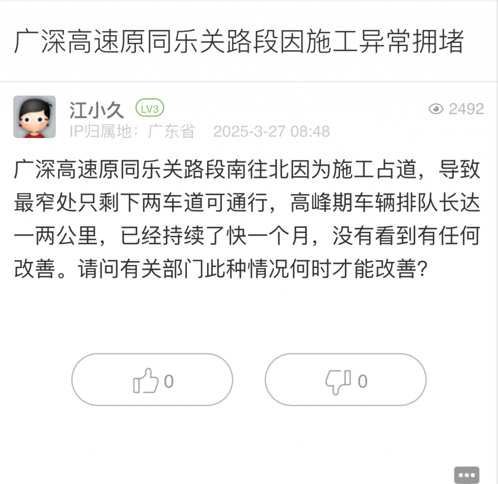 12. 帖文《廣深高速原同樂關(guān)路段因施工異常擁堵》