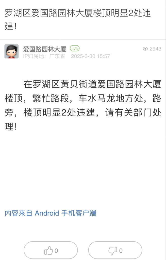 31. 帖文《羅湖區(qū)愛國路園林大廈樓頂明顯2處違建!》