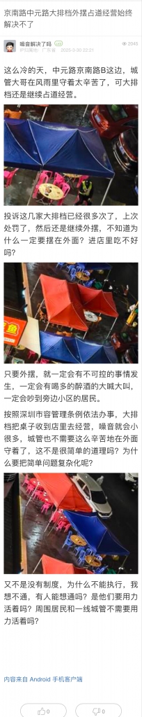 26. 帖文《京南路中元路大排檔外擺占道經(jīng)營始終解決不了》