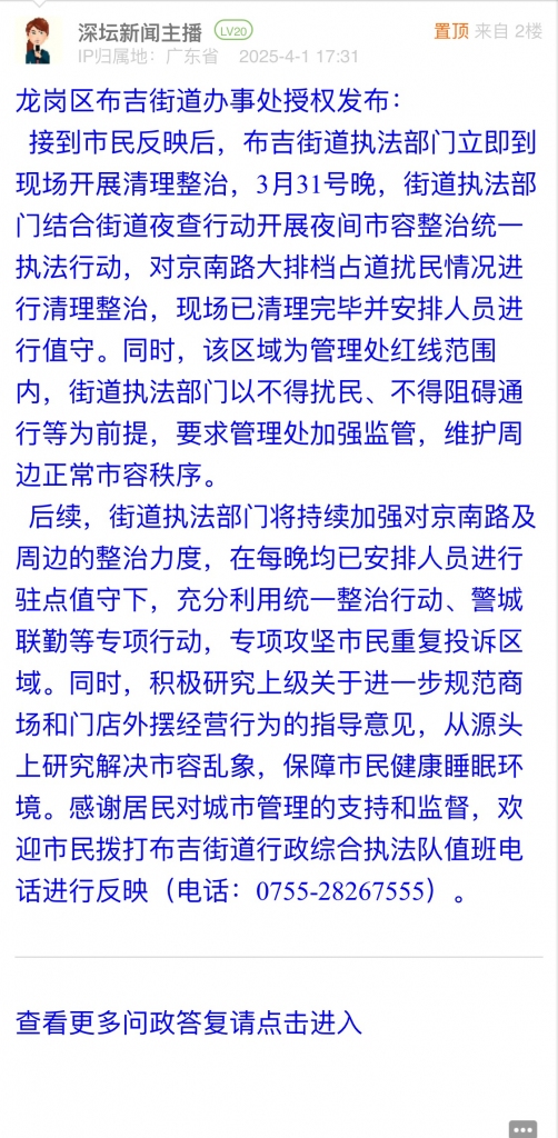 后續(xù),街道執(zhí)法部門將持續(xù)加強(qiáng)對京南路及周邊的整治力度,在每晚均已安排人員進(jìn)行駐點值守下,充分利用統(tǒng)一整治行動、警城聯(lián)勤等專項行動,專項攻堅市民重復(fù)投訴區(qū)域。同時,積極研究上級關(guān)于進(jìn)一步規(guī)范商場和門店外擺經(jīng)營行為的指導(dǎo)意見,從源頭上研究解決市容亂象,保障市民健康睡眠環(huán)境。感謝居民對城市管理的支持和監(jiān)督,歡迎市民撥打布吉街道行政綜合執(zhí)法隊值班電話進(jìn)行反映(電話:0755-28267555)。