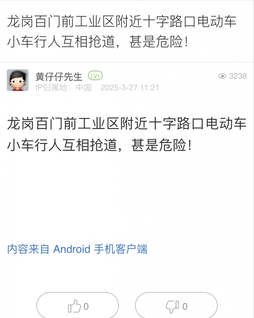 14. 帖文《龍崗百門前工業(yè)區(qū)附近十字路口電動車小車行人互相搶道,甚是危險!》