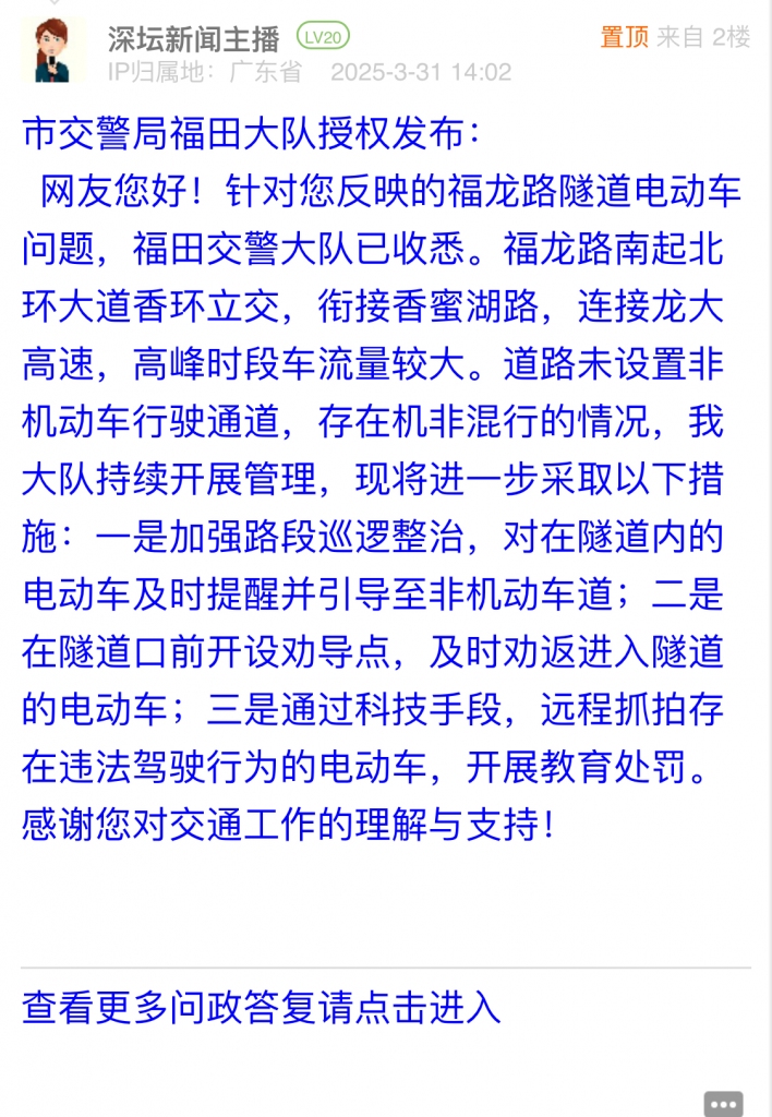 網(wǎng)友您好!針對您反映的福龍路隧道電動車問題,福田交警大隊已收悉。福龍路南起北環(huán)大道香環(huán)立交,銜接香蜜湖路,連接龍大高速,高峰時段車流量較大。道路未設(shè)置非機(jī)動車行駛通道,存在機(jī)非混行的情況,我大隊持續(xù)開展管理,現(xiàn)將進(jìn)一步采取以下措施:一是加強(qiáng)路段巡邏整治,對在隧道內(nèi)的電動車及時提醒并引導(dǎo)至非機(jī)動車道;二是在隧道口前開設(shè)勸導(dǎo)點,及時勸返進(jìn)入隧道的電動車;三是通過科技手段,遠(yuǎn)程抓拍存在違法駕駛行為的電動車,開展教育處罰。感謝您對交通工作的理解與支持!