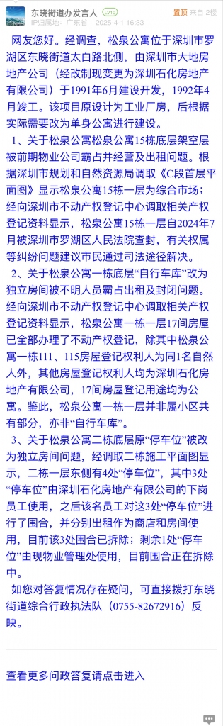 1、關(guān)于松泉公寓松泉公寓15棟底層架空層被前期物業(yè)公司霸占并經(jīng)營及出租問題。根據(jù)深圳市規(guī)劃和自然資源局調(diào)取《C段首層平面圖》顯示松泉公寓15棟一層為綜合市場;經(jīng)向深圳市不動產(chǎn)權(quán)登記中心調(diào)取相關(guān)產(chǎn)權(quán)登記資料顯示,松泉公寓15棟一層自2024年7月被深圳市羅湖區(qū)人民法院查封,有關(guān)權(quán)屬等糾紛問題建議市民通過司法途徑解決。