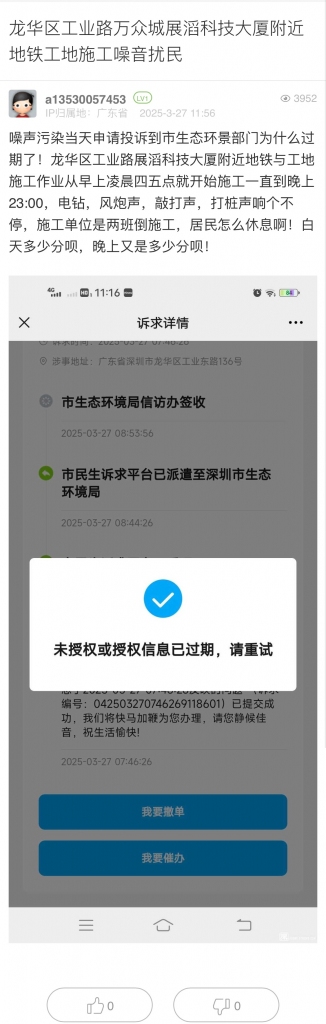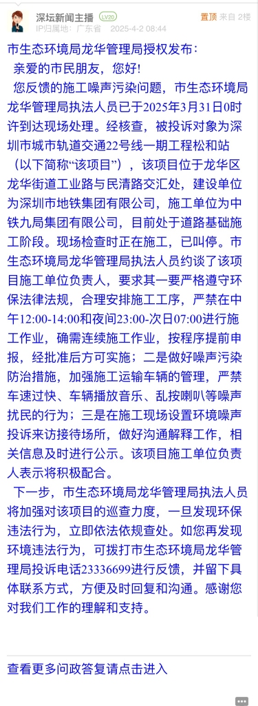 15. 帖文《龍華區(qū)工業(yè)路萬眾城展滔科技大廈附近地鐵工地施工噪音擾民》