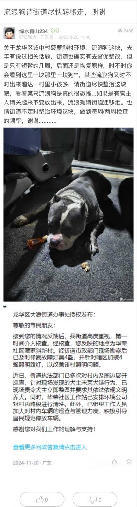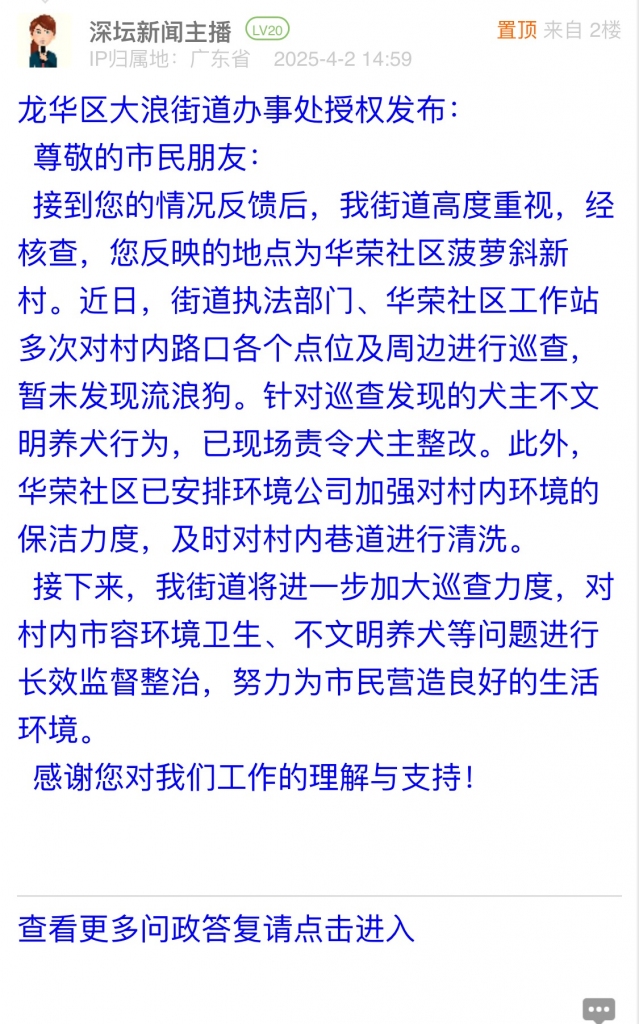 接到您的情況反饋后,我街道高度重視,經(jīng)核查,您反映的地點為華榮社區(qū)菠蘿斜新村。近日,街道執(zhí)法部門、華榮社區(qū)工作站多次對村內(nèi)路口各個點位及周邊進(jìn)行巡查,暫未發(fā)現(xiàn)流浪狗。針對巡查發(fā)現(xiàn)的犬主不文明養(yǎng)犬行為,已現(xiàn)場責(zé)令犬主整改。此外,華榮社區(qū)已安排環(huán)境公司加強(qiáng)對村內(nèi)環(huán)境的保潔力度,及時對村內(nèi)巷道進(jìn)行清洗。