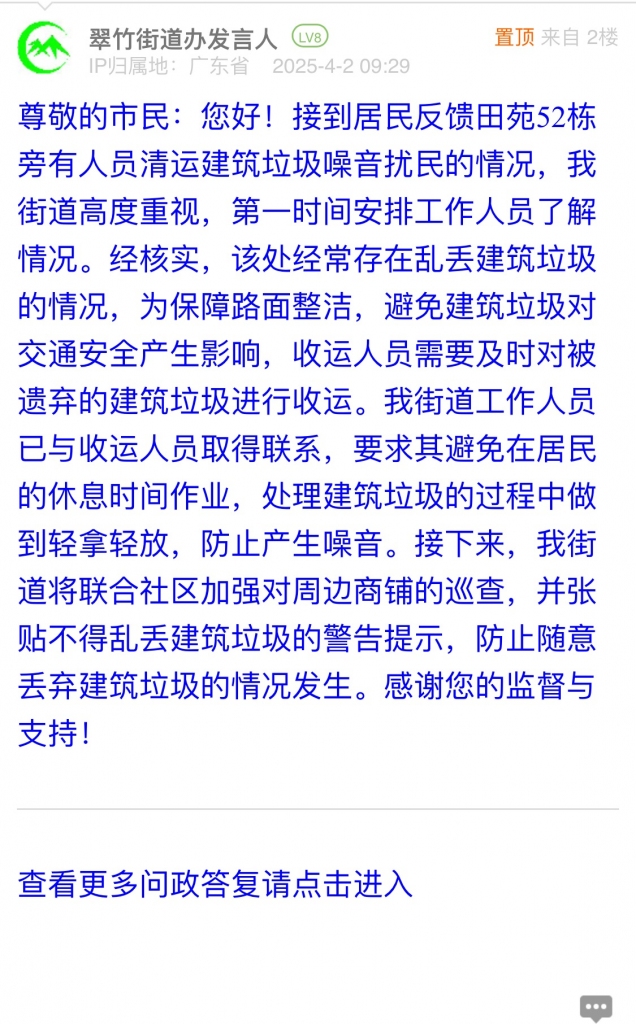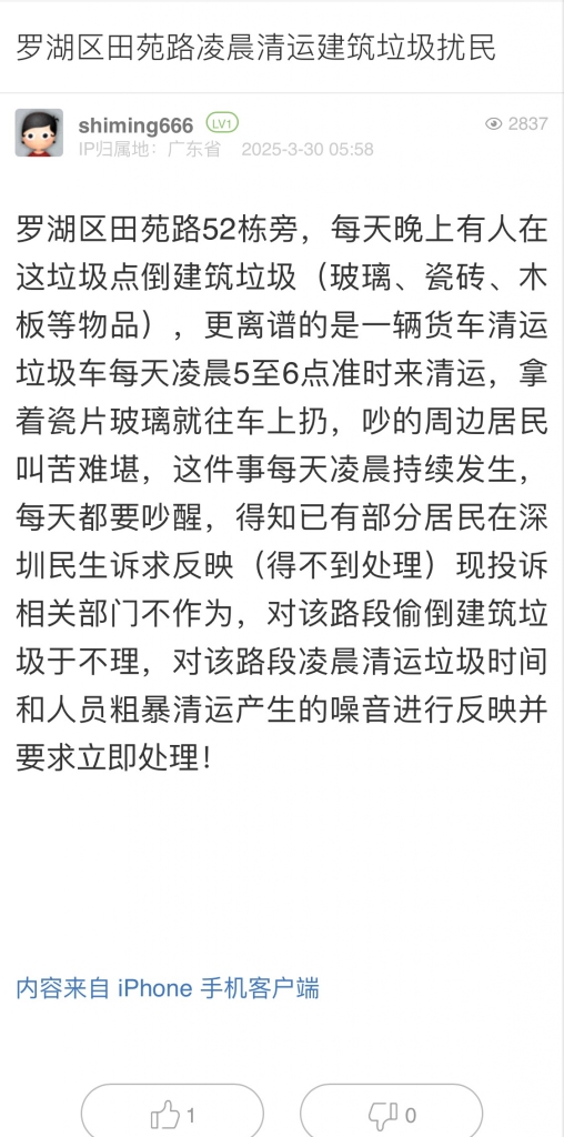 23. 帖文《羅湖區(qū)田苑路凌晨清運建筑垃圾擾民》