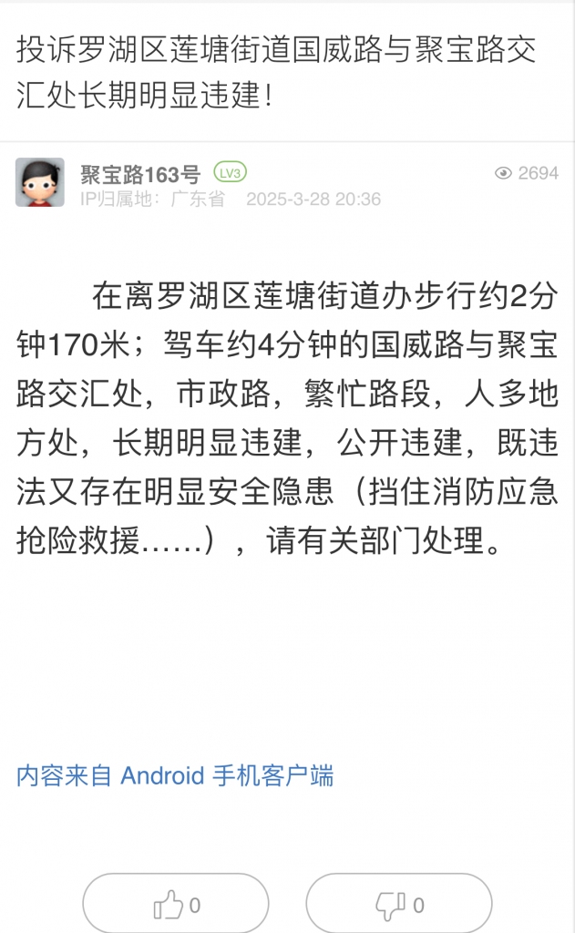 21. 帖文《投訴羅湖區(qū)蓮塘街道國威路與聚寶路交匯處長期明顯違建!》