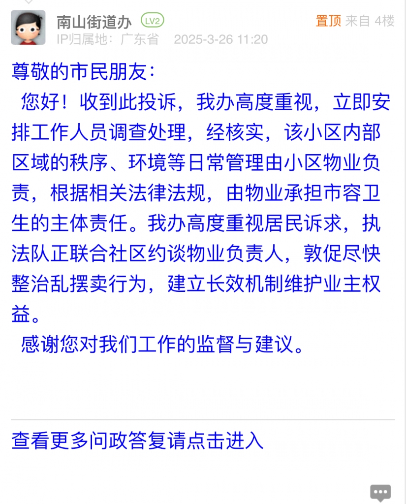 3. 帖文《【投訴】南山街道月亮灣花園亂擺賣入侵小區(qū)內(nèi)部,僅干凈清靜兩星期,物業(yè)不作為,業(yè)主投訴,欺騙業(yè)主》