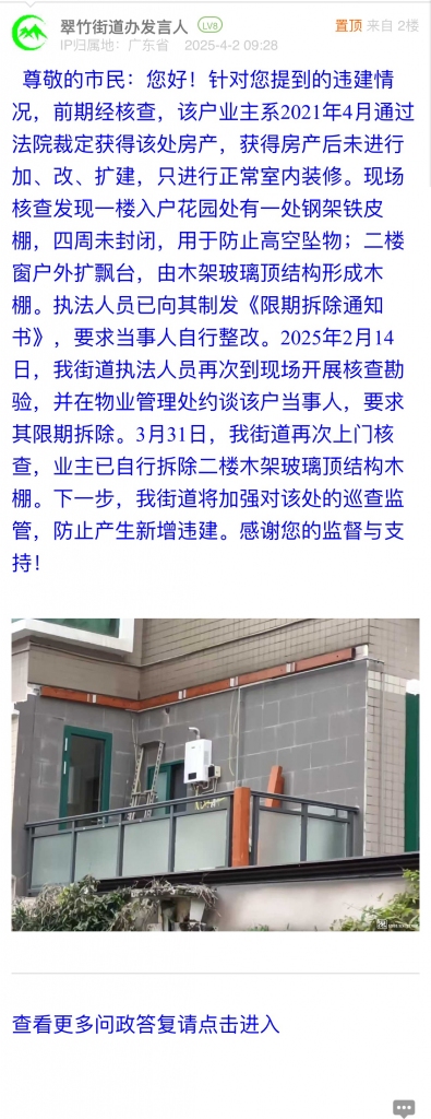 尊敬的市民:您好!針對您提到的違建情況,前期經(jīng)核查,該戶業(yè)主系2021年4月通過法院裁定獲得該處房產(chǎn),獲得房產(chǎn)后未進(jìn)行加、改、擴(kuò)建,只進(jìn)行正常室內(nèi)裝修。現(xiàn)場核查發(fā)現(xiàn)一樓入戶花園處有一處鋼架鐵皮棚,四周未封閉,用于防止高空墜物;二樓窗戶外擴(kuò)飄臺,由木架玻璃頂結(jié)構(gòu)形成木棚。執(zhí)法人員已向其制發(fā)《限期拆除通知書》,要求當(dāng)事人自行整改。2025年2月14日,我街道執(zhí)法人員再次到現(xiàn)場開展核查勘驗,并在物業(yè)管理處約談該戶當(dāng)事人,要求其限期拆除。3月31日,我街道再次上門核查,業(yè)主已自行拆除二樓木架玻璃頂結(jié)構(gòu)木棚。下一步,我街道將加強(qiáng)對該處的巡查監(jiān)管,防止產(chǎn)生新增違建。感謝您的監(jiān)督與支持!