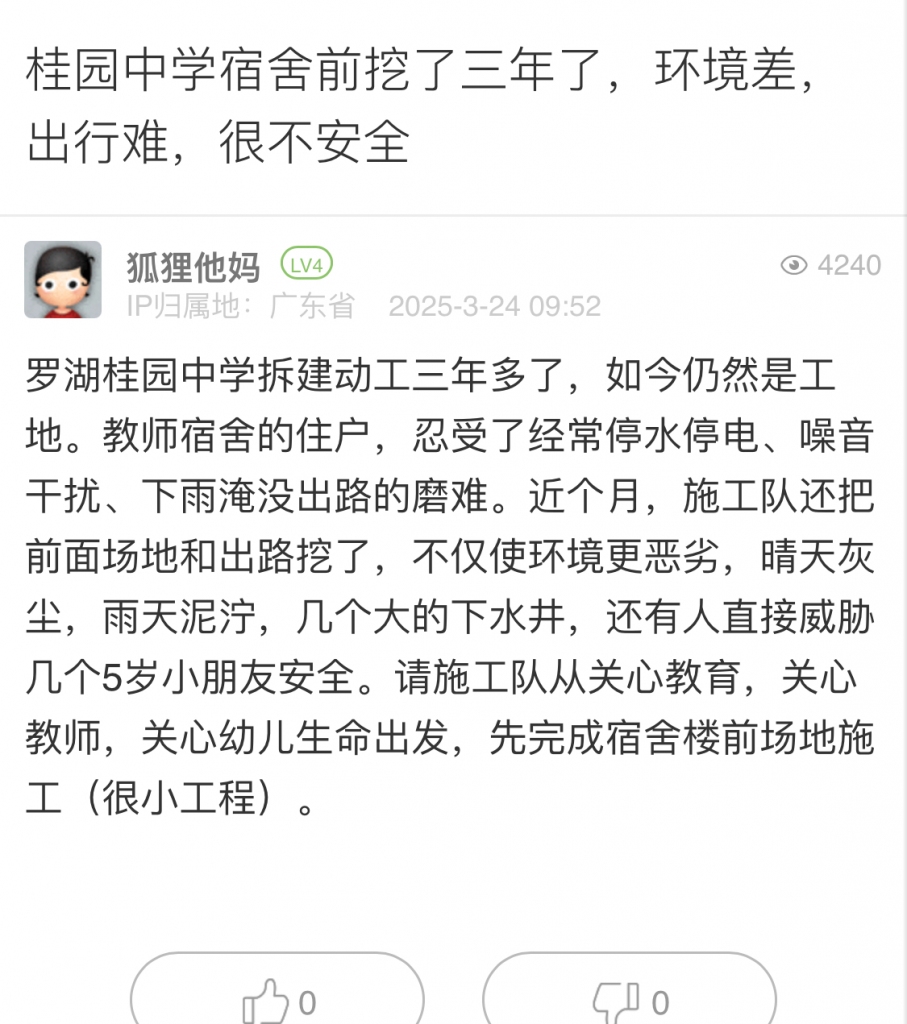 1. 帖文《桂園中學(xué)宿舍前挖了三年了,環(huán)境差,出行難,很不安全》