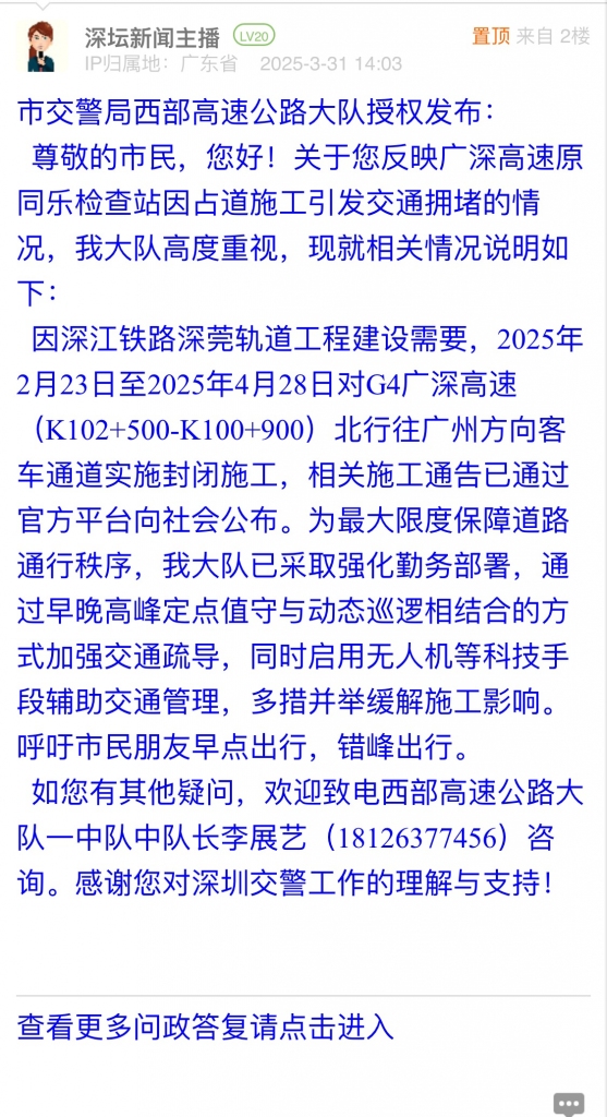 因深江鐵路深莞軌道工程建設(shè)需要,2025年2月23日至2025年4月28日對G4廣深高速(K102+500-K100+900)北行往廣州方向客車通道實施封閉施工,相關(guān)施工通告已通過官方平臺向社會公布。為最大限度保障道路通行秩序,我大隊已采取強(qiáng)化勤務(wù)部署,通過早晚高峰定點值守與動態(tài)巡邏相結(jié)合的方式加強(qiáng)交通疏導(dǎo),同時啟用無人機(jī)等科技手段輔助交通管理,多措并舉緩解施工影響。呼吁市民朋友早點出行,錯峰出行。
