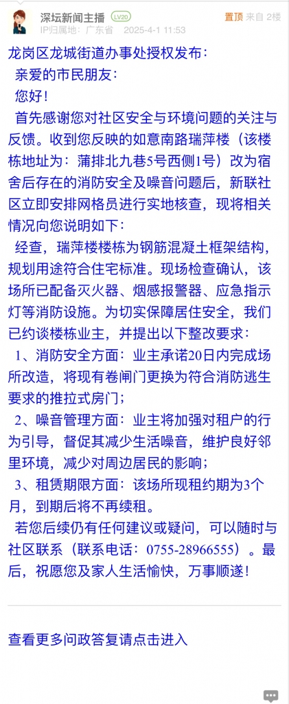 25. 帖文《龍崗區(qū)如意南路蒲排北瑞萍樓一樓店鋪被改成工人宿舍》