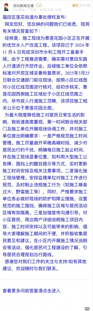 經(jīng)核查,施工現(xiàn)場為景蓮花園小區(qū)正在開展的優(yōu)飲水入戶改造工程。該項目已于 2024 年 11 月 6 日完成深圳市水利工程開工備案手續(xù)。由于工程推進(jìn)需要,確實需對景田東路人行道進(jìn)行開挖作業(yè),后續(xù)施工單位會依照標(biāo)準(zhǔn)對開挖區(qū)域妥善恢復(fù)原狀。2025年3月25日聯(lián)合交通部門前往現(xiàn)場,按照小區(qū)紅線圖對小區(qū)紅線范圍進(jìn)行核對,經(jīng)初步核實,景蓮花園西側(cè)施工區(qū)域處于小區(qū)紅線范圍之內(nèi),非市政人行道施工范疇,該項目施工相關(guān)公示位于景蓮花園北側(cè)。